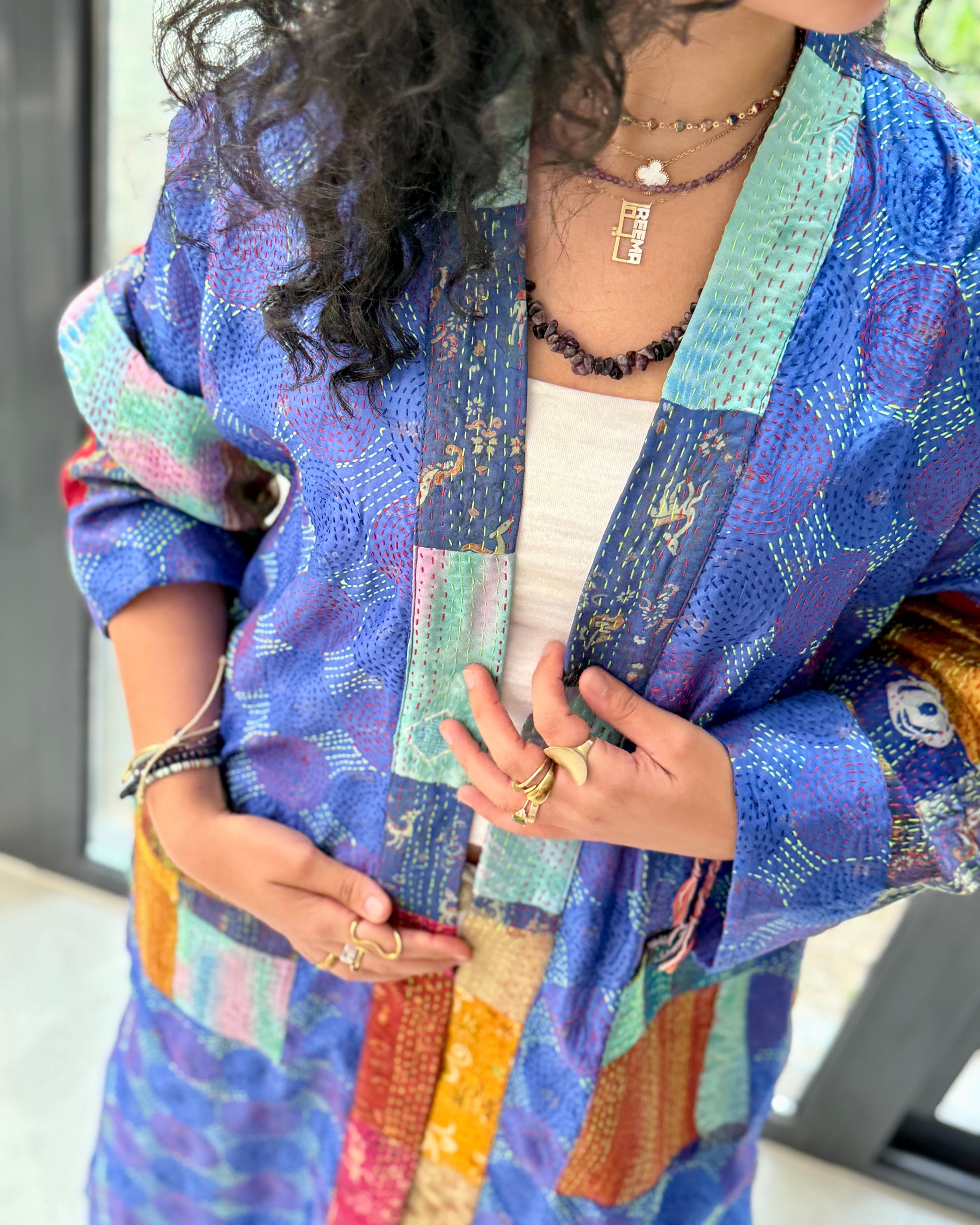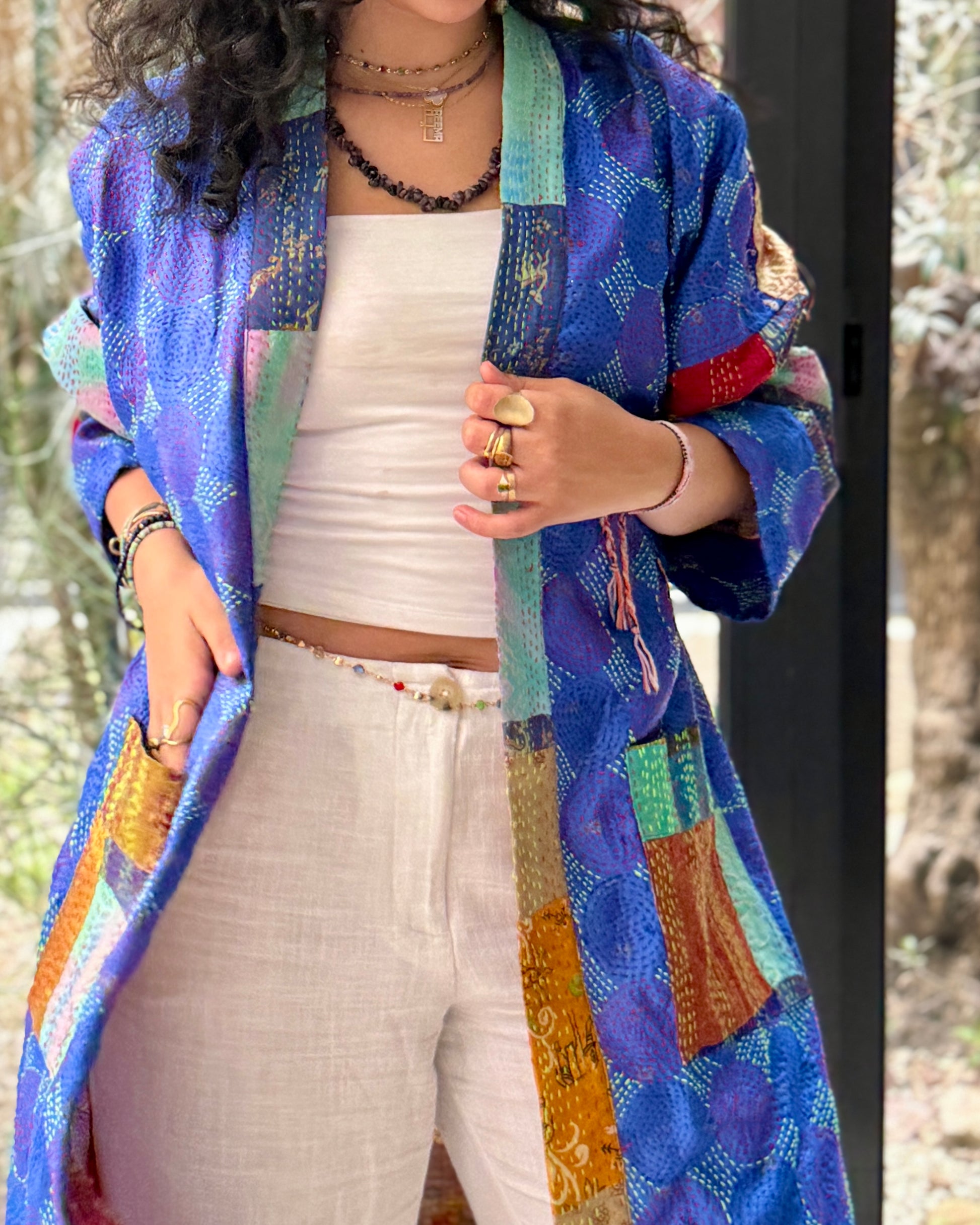 Base color: cobalt/indigo blue. Secondary: teal, magenta, saffron, orange (with stiches forming a circle motif)
