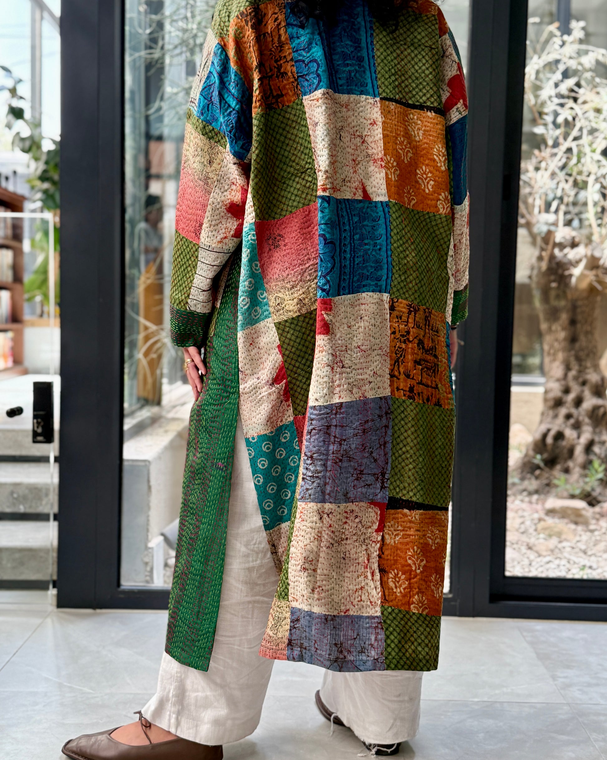 Base color: emerald green. Secondary: burgundy, pink, rust orange, blue, beige (flips to burgundy on the inside).