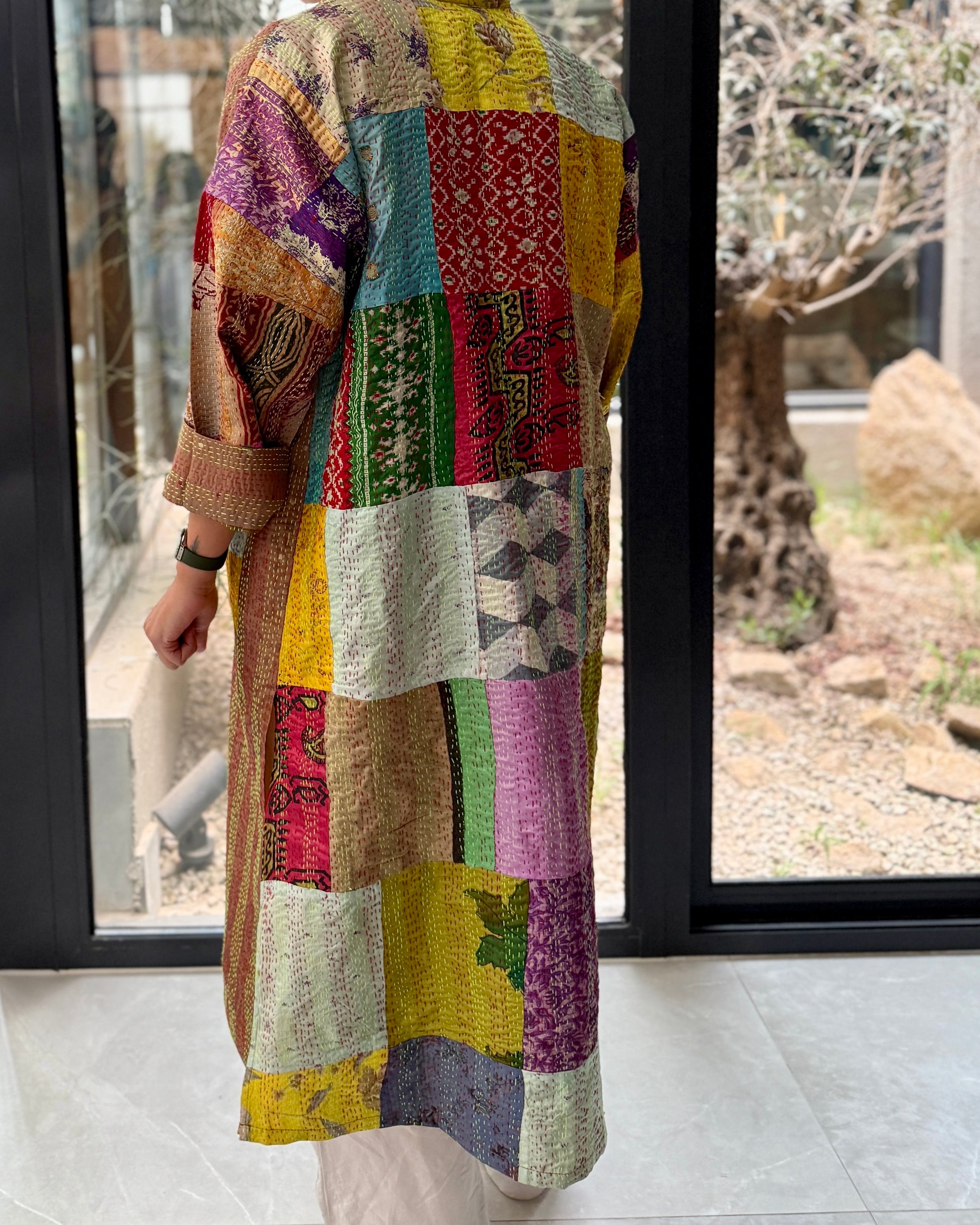 Base color: coppery brown with golden stiches. Secondary: pops of bright turquoise, red, ikat, yellow, pastel purple and green.