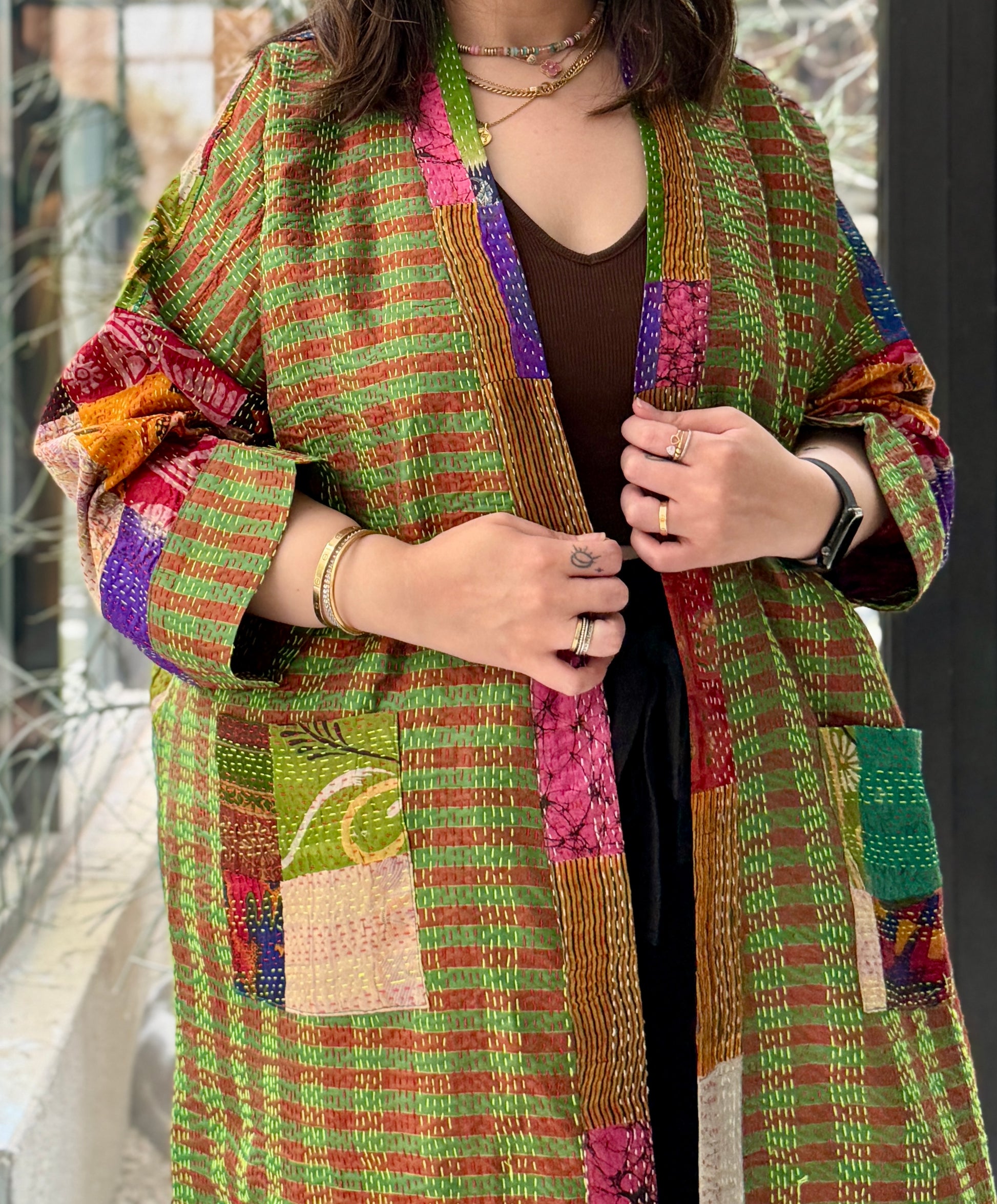 Base color: bright green. Secondary: rust orange, pink, yellow, and purple
