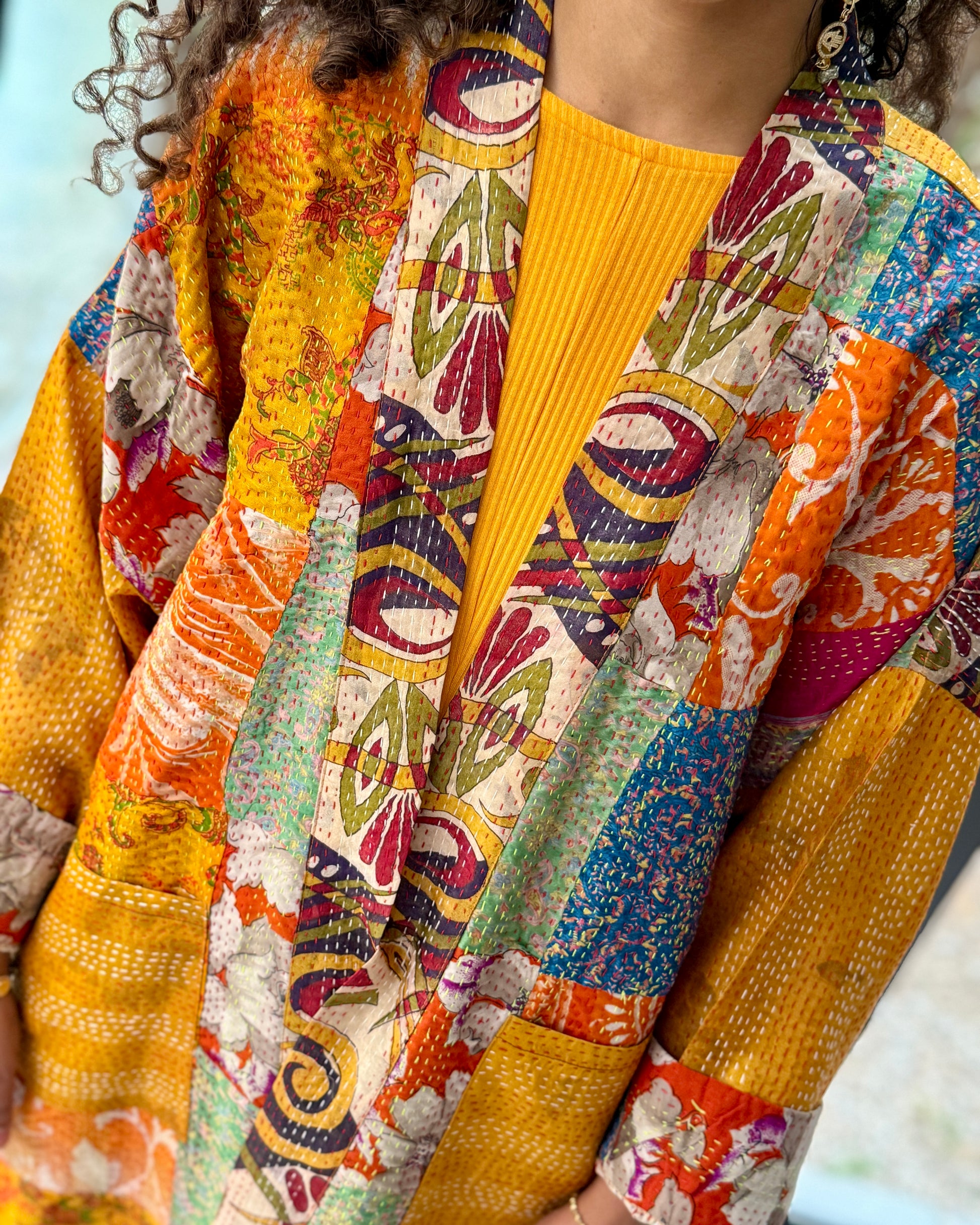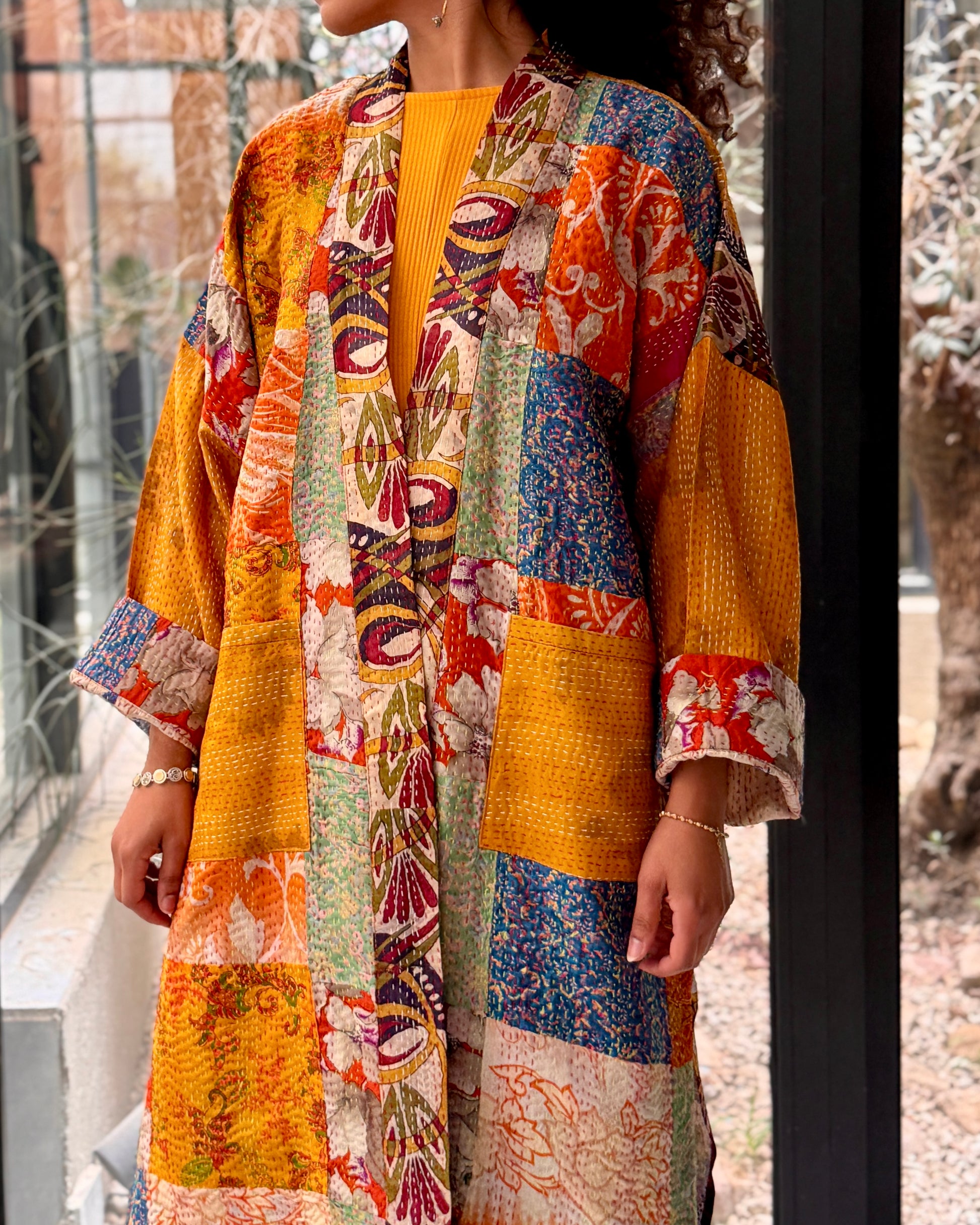 Base color: rich saffron/golden yellow. Secondary: bright orange, and cobalt blue blocks with floral cream accents