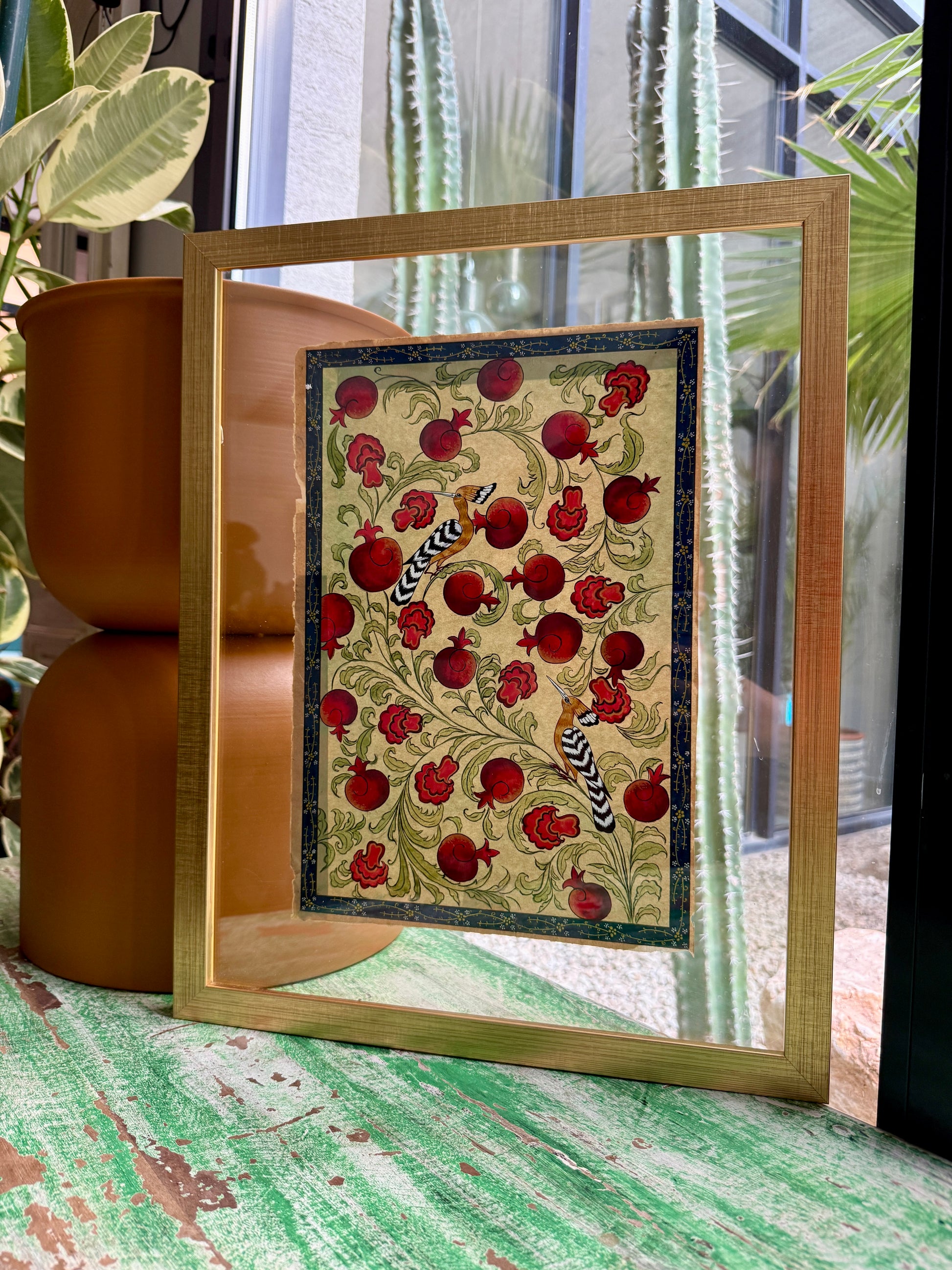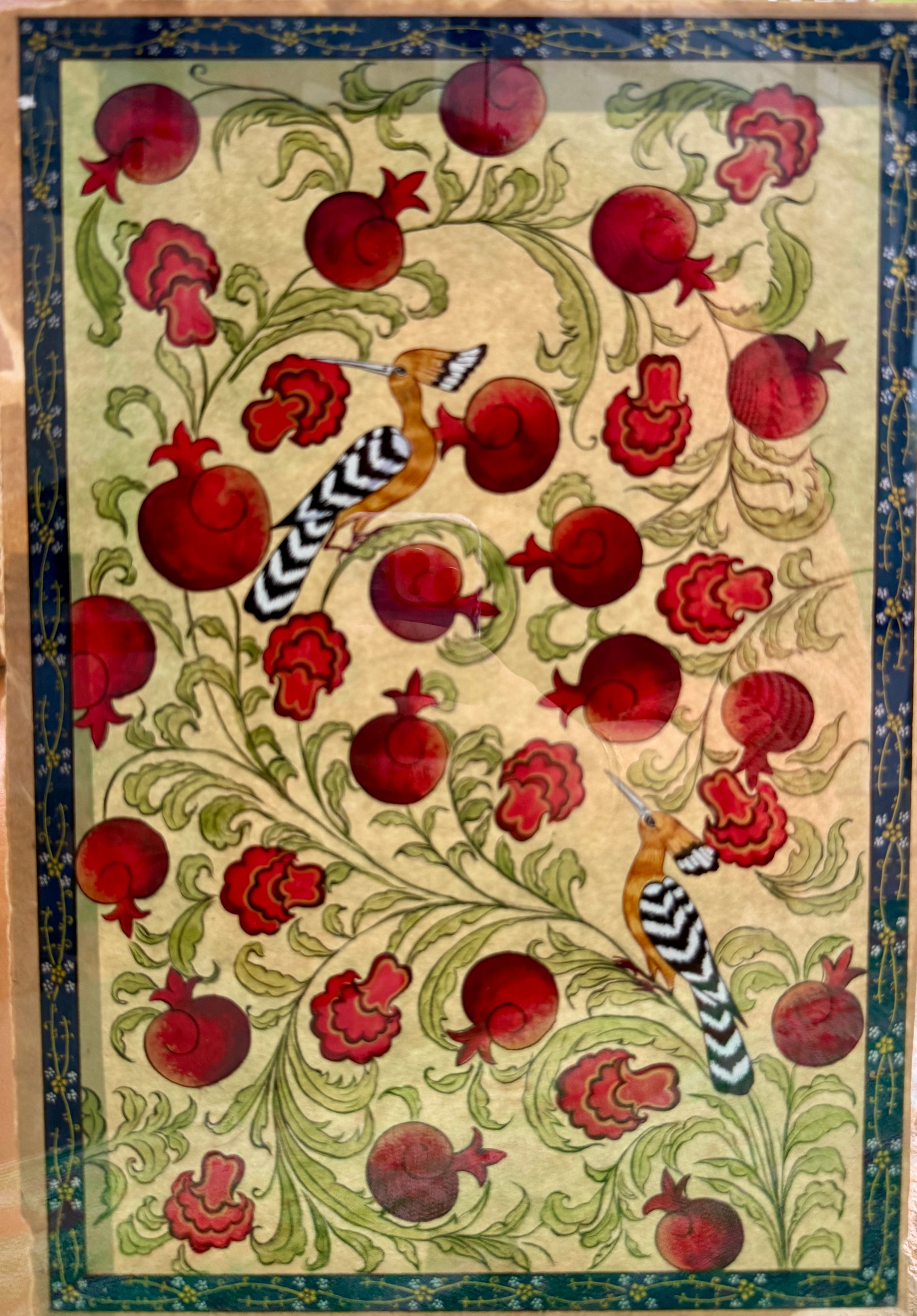 The colors collide and harmonize in a way only classical miniatures dare: pomegranate skins glowing like rubies, blossoms unfurling in rose and crimson, and the hoopoe’s golden body glinting between them like a secret. In this portrait, the hoopoe stands as both messenger and monarch; the one who knows that the path to the divine is neither distant nor ornate, but found in the quiet courage to follow one’s own inner summons. A tribute to guidance, beauty, and the fruits that grow when a soul is brave enough to journey inward.