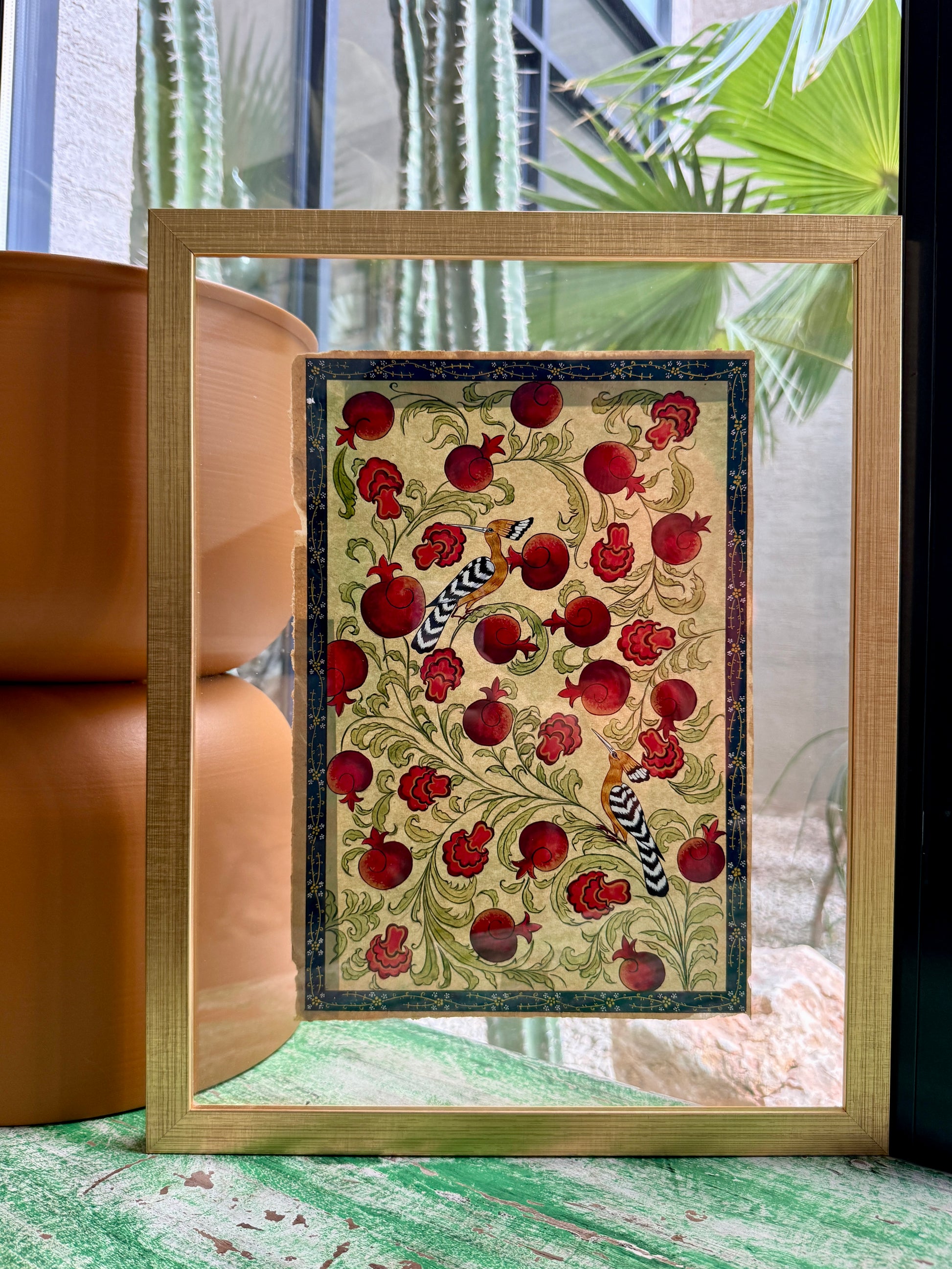 This miniature captures that same silent sovereignty: the hoopoe perched among monumental pomegranates, its striped wings cutting boldly through a garden of bursting reds and soft greens. Here, the fruit of knowledge grows impossibly large, as if to remind us that wisdom is not fragile: it is rather lush, abundant, and ripe for those who seek it with sincerity.