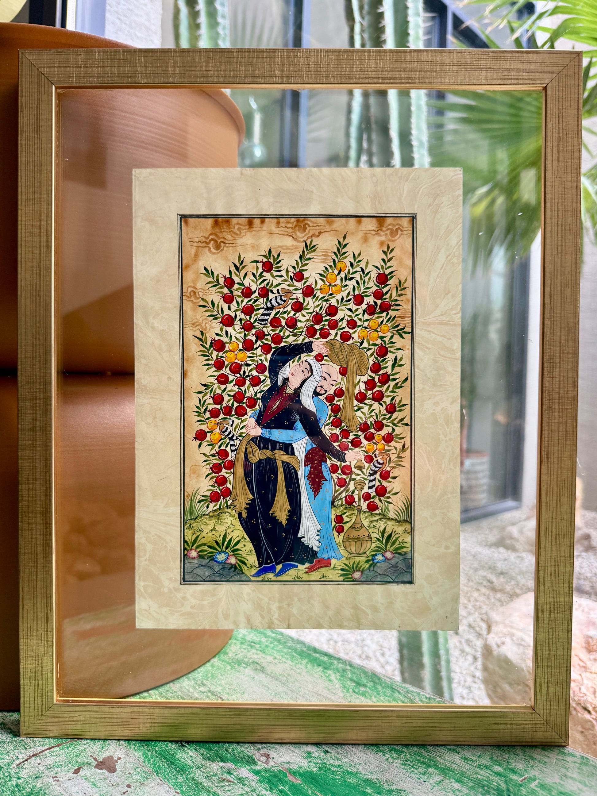 In this moment, love becomes a spiritual state. The pomegranate branches arc above them like a blessing, each seed a small universe, each blossom a doorway to deeper knowing. This miniature captures the delicate threshold where passion melts into presence, where lovers become seekers without even realizing it, and where a simple embrace beneath a fruit-laden tree becomes a pilgrimage of its own.